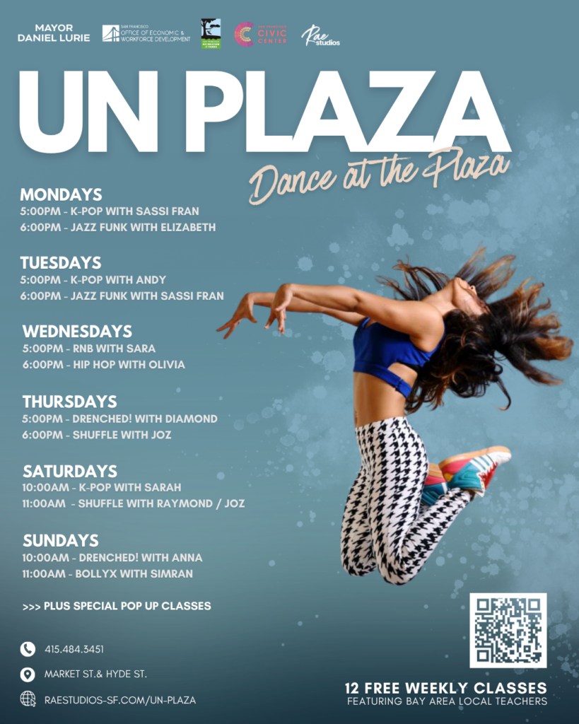 Get moving at the fitness classes led by Rae Studios in UN Plaza! From jazz funk to salsa, and K-Pop to hip hop, there are a bunch of free, daily fitness classes!